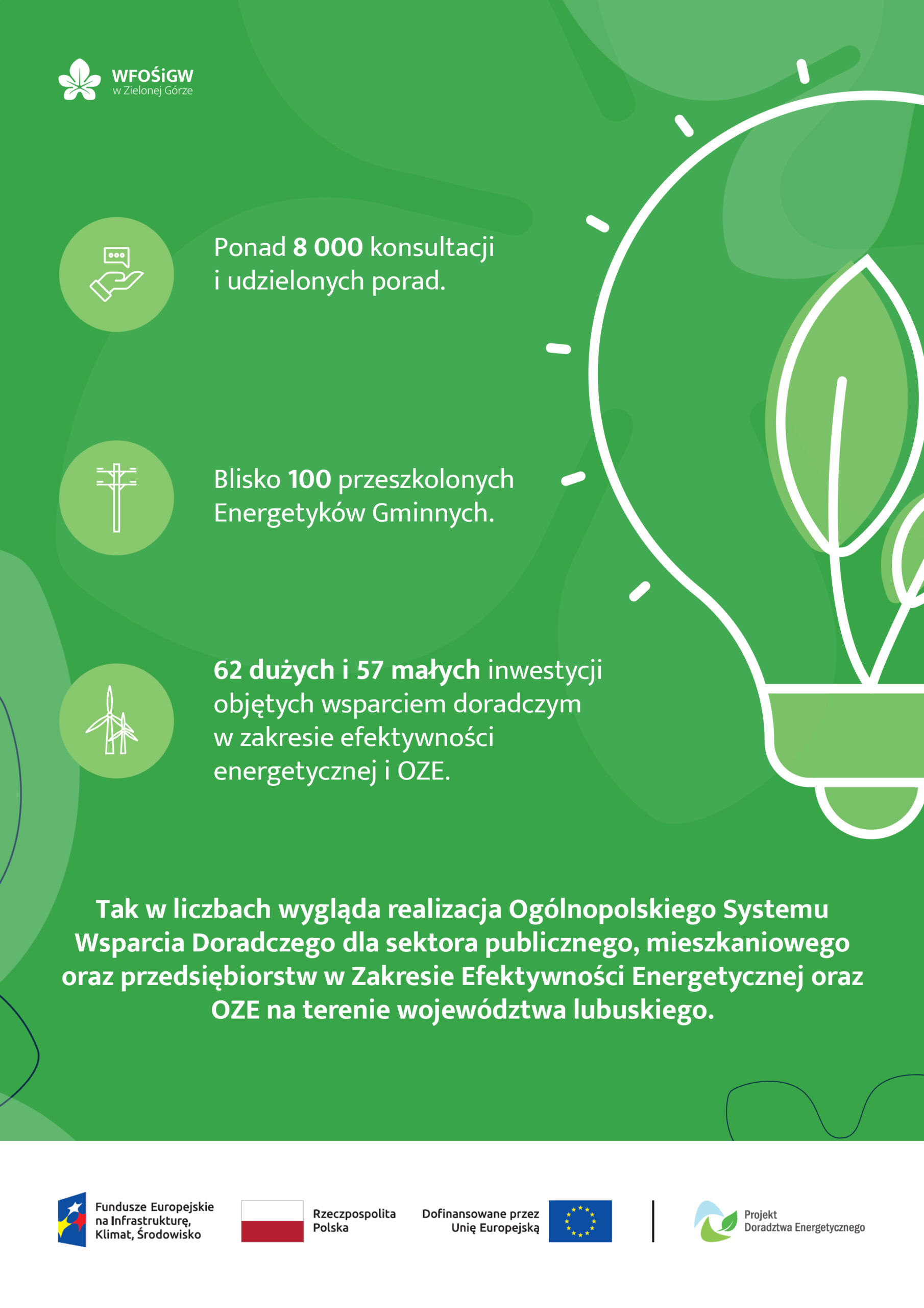 Jak podaje Wojewódzki Fundusz Ochrony Środowiska i Gospodarki Wodnej w Zielonej Górze w województwie lubuskim zrealizowano ponad 8 000 konsultacji, przeszkolono blisko 100 kandydatów na Energetyka Gminnego, a także objęto wsparciem doradczym w zakresie efektywności energetycznej i OZE 62 dużych i 57 małych inwestycji.