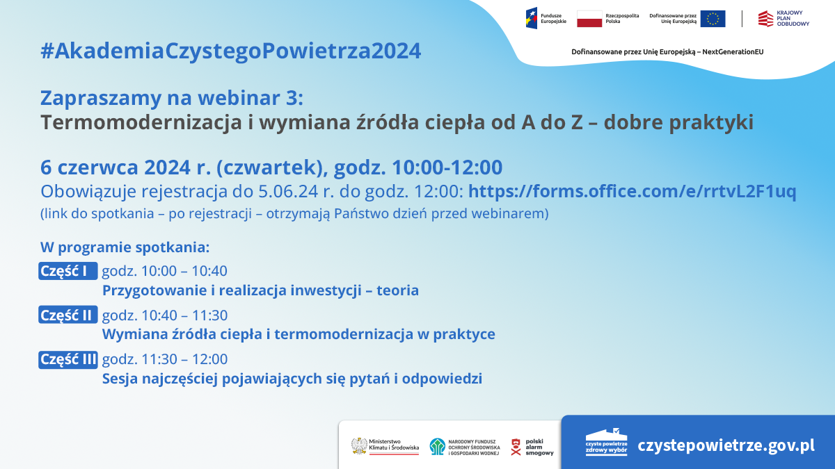 Przygotowanie i realizacja inwestycji w teorii oraz wymiana źródła ciepła i termomodernizacja w praktyce – to tematy najbliższego spotkania w ramach cyklu #AkademiaCzystegoPowietrza2024. Webinar, na który każdy zainteresowany może się już zarejestrować (https://forms.office.com/e/rrtvL2F1uq), odbędzie się w czwartek, 6 czerwca o godz. 10:00.